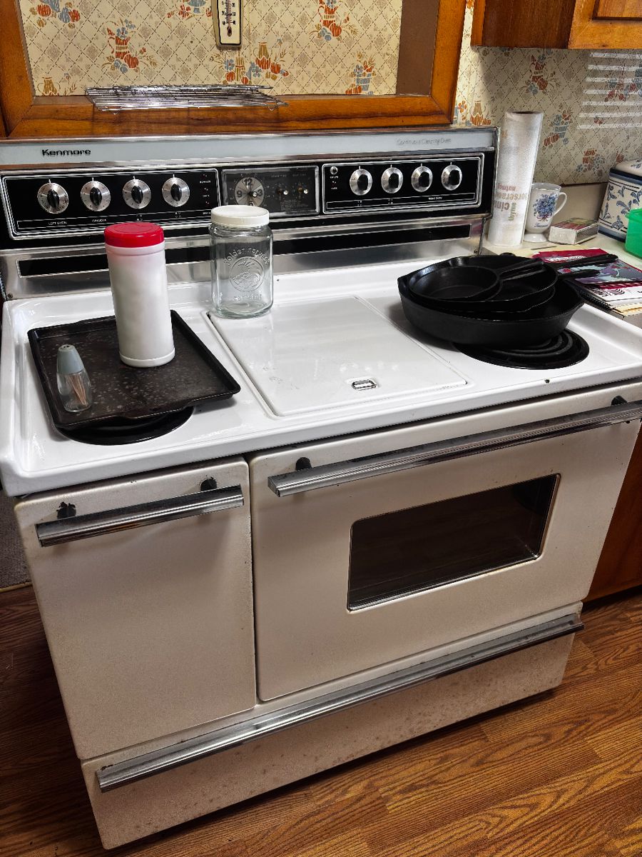 Electric stove, gas stove, washer/dryer, freezers, refrigerator, hand tools/garden tools, garden equipment, TONS of canned goods & TONS of supplies to do your own canning, chrome/formica vintage table with 4 chairs, recliners, sofas, Tiller, air compressor, 3-wheel bike, wheel barrows, Hoosier cabinet, metal sink base with porcelain double sink, Vintage clothing, Wood bedroom set, sewing supplies, Queen size mattress set, Glider rockers, Wood dining table/6 chairs, Lots of kitchen/cooking supplies, Sewing machine, wrought iron patio furniture, LOTS MORE ADDING!,