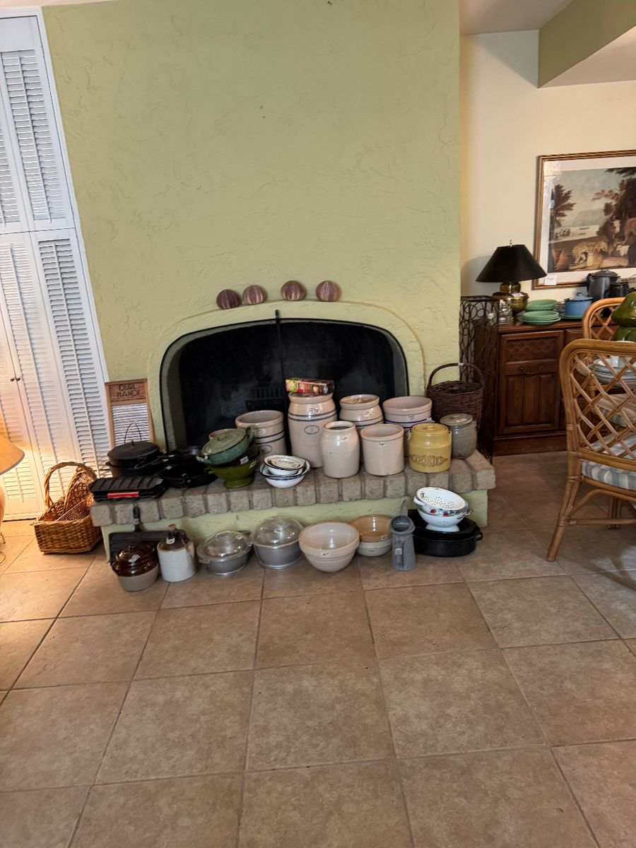 This is an awesome estate sale! We have antiques, collectibles, artwork, slag glass lamp, pottery by Bauer, fiesta ware, McCoy, Roseville, Haeger, and others, we have Baccarat, Waterford, Vannes Kosta Boda, and other crystal, art glass, depression glass, carnival glass, furniture, including La-Z-Boy, Gibson china, Mikasa china, Southwest collectibles, silver plated flatware set, ostrich eggs, Wedgwood, Asian collectibles, cat collection, Vaseline glass, Lenox, Orrefors, red wing pottery, jewel tea, lots of vintage kitchen collectibles, Jadite, Fire king, Pyrex, to name a few, cast-iron, crocks, enamelware, pots, and pans, collection of milk glass, Anchor Hocking, JA Henkel knife set, Cuisinart, vintage...