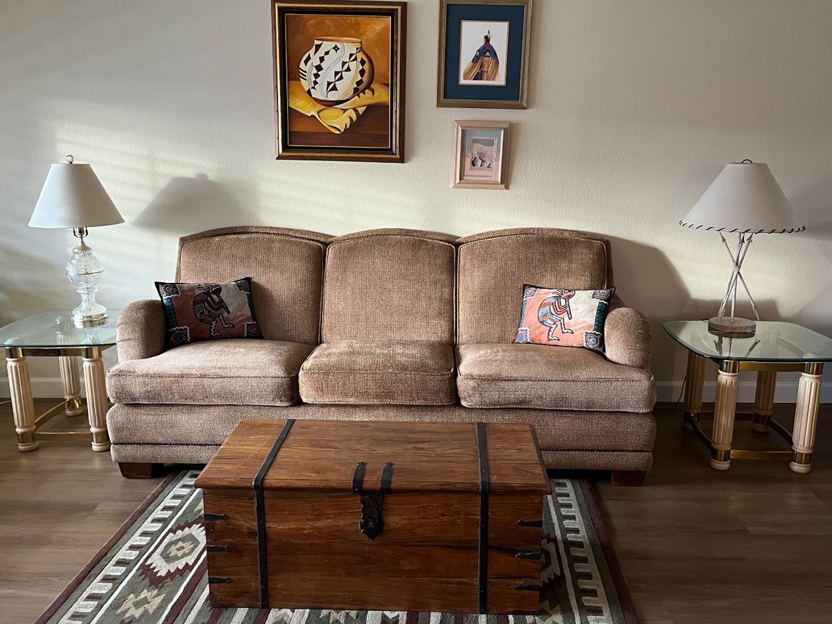 Nice clean sale with a mix of contemporary furniture and everyday usable household items. HIGHLIGHTS: - Southwest pottery and art LIVING ROON FURNITURE: - Clean contemporary brown sofa 7’ x 39” x 36” - Tan Lazyboy recliner - Burgundy recliner - Brown upholstery wood glider rocker eith ottoman - 2 Glass top and gold end tables 26” x 26” x 20” - Teal cane back armchair - Taupe brown loveseat 57” x 36” x 36” - Brown rattan end table 20”x 25” x 24” - Brown rattan folding shelf 24” x 14” x 41” - Low contemporary black Tv and...