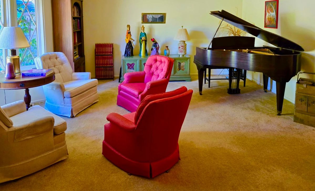 Collectors and designers will not know where to start in this lovely mid century family home! Our client is an accomplished seamstress, cook and crafts person, and has cast her unerringly artistic eye to her artistic decor, studio pottery, Asian art and home goods, MCM furnishings, art and lighting! At over a century young, she has enjoyed travel while sharpening her own decorating, cooking, musical and gardening skills, and her home glows with every loving detail. Here's an overview of the rooms full of treasures you'll find: Baby Grand piano; 70s tapestry sofa; three separate pairs of vintage club chairs;...