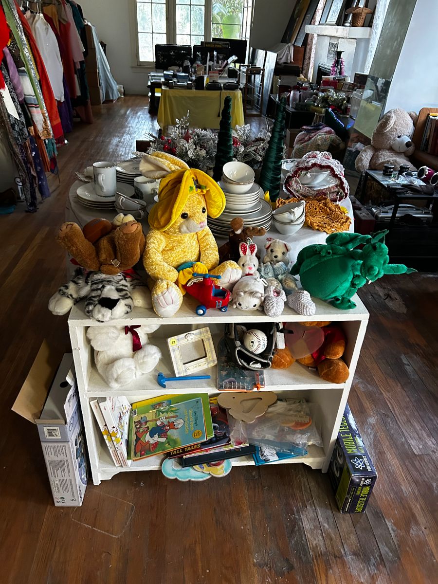 Men’s, women’s, and children’s clothes, scarves, costume jewelry, paintings, vases, home decor, kitchenware, books, knickknacks, plates, cups, and glasses.
