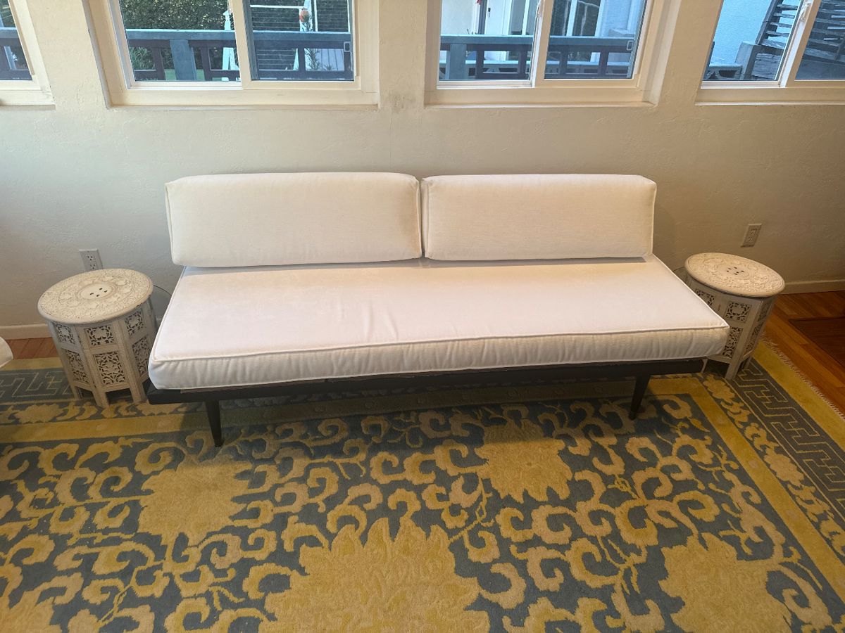 A Very Nice Collection with Vintage Treasures. Vintage Adrian Pearsall Style Gondola Sofa. Lovely Original Fabric. Mid Century Modern Daybed White Sofa. Large Buddha Heads. Garden Statues. Franklin Mint Gloria Vanderbilt 23 Spice Jar Set with Shelf. Lovely Vintage Lighted Ceramic Christmas Tree. Pair Large German Figurines. Carved Pair of White End Tables. White Round Disk Chairs. Robert Landry Watercolors. Large Oil Painting Horses. Vinyl Records. Lovely Desert Landscape. Wrought Iron Dining Table and Chairs. Model Cars and Vintage Auto Parts and Books. Many Power Tools. Garage Full of Tools and Car Related Items. Nice Queen Bed Frame with Egyptian...