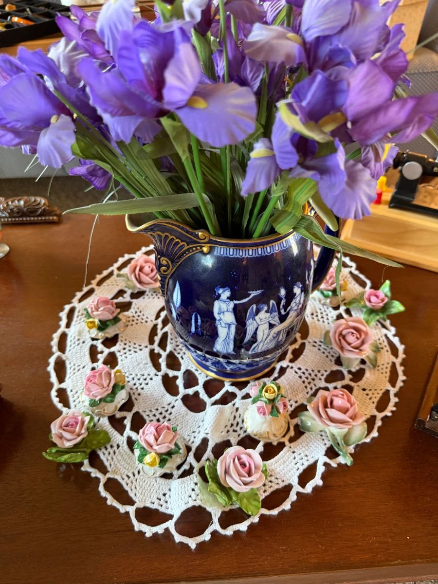 GE washer and dryer, refrigerator, Victrola tall wooden case, White antique sewing machine with wooden cover, Singer antique sewing machine, sewing machine cases, Dresden china, Antique hutch, Lots of outdoor novelty items, Old Lanterns, Mid-century hutch, Twin bed mattresses, full bed mattress, Furniture in variety, women's clothes, Several antique iceboxes, Singer, vintage sewing machine in case, Novelty children's toys, Antique and vintage Fire King bowls, Fiesta ware, Quilting fabric and books, Linens, Blower, Vacuum, tools, misc. items in variety,