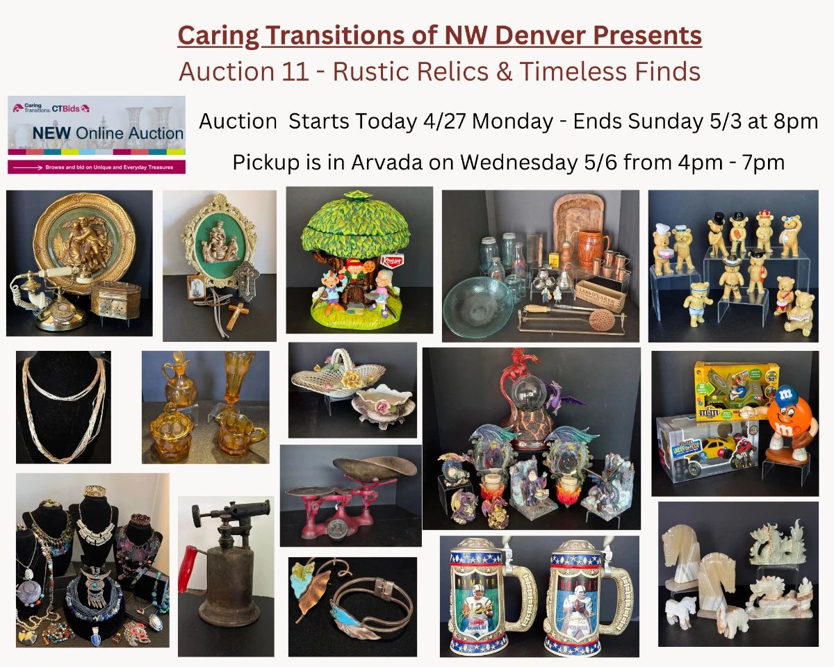 Auction 11 – Rustic Relics & Timeless Finds Auction Starts – Today 4/27 Monday – Ends Sunday 5/3 at 8pm Auction Pickup is in Arvada on – Wednesday 5/6 from 4pm – 7pm Please bid at: https://ctbids.com/estate-sale/43754 Gold, antiques, vintage gems & totally unique finds—this sale has it ALL. Whether you’re a collector, decorator, reseller, or just love the thrill of the hunt… you don’t want to miss this one. 💎 Highlights Include: • 14K gold jewelry, opals & sterling pieces • Antique cocktail watches, scales & ship clock • 18th–19th century Italian art prints • Vintage Pyrex, Corningware &...