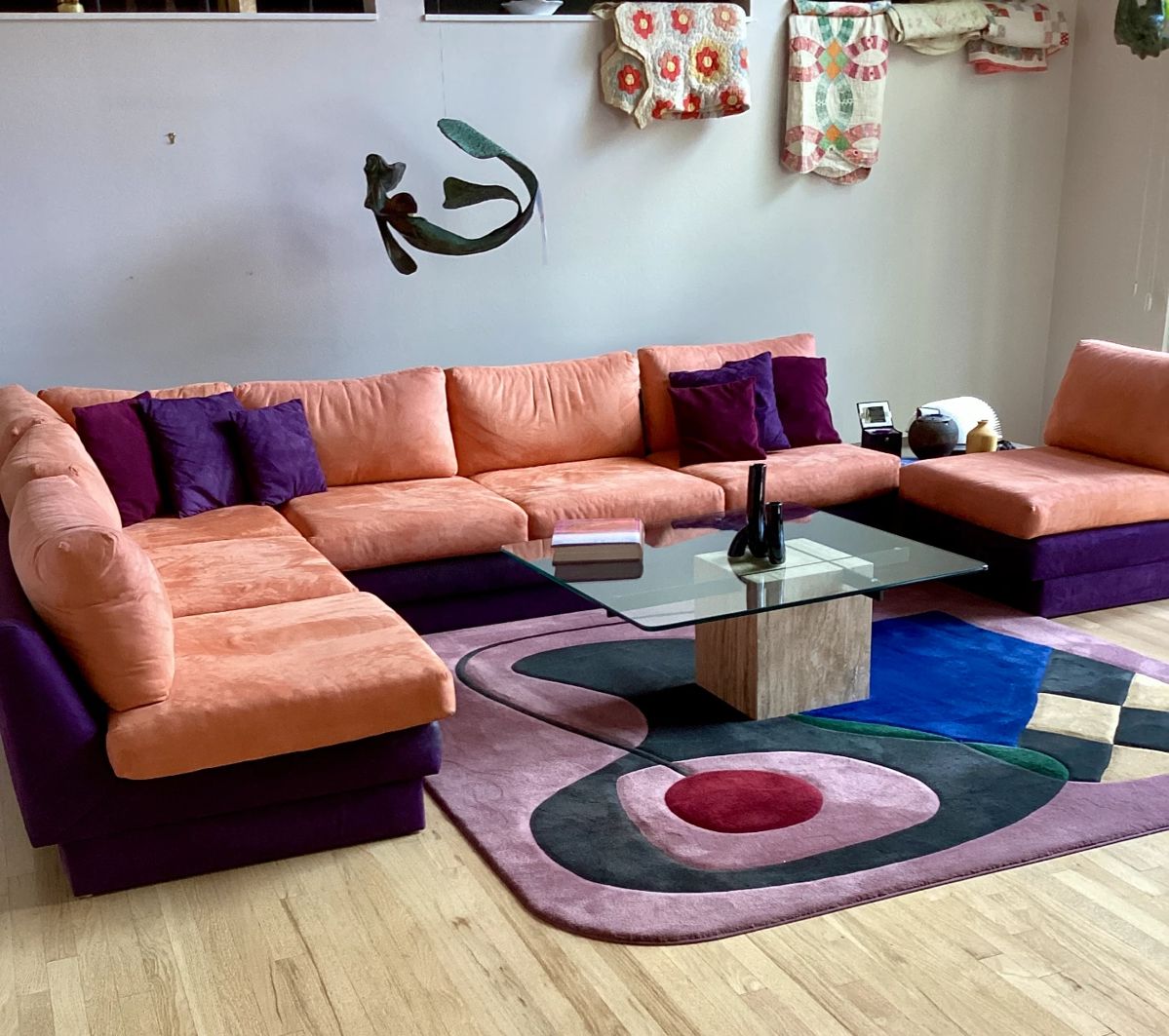 Designer clothing, crystal, furniture, art, 1950s Buick Road master vibrant vintage purple and orange sofa Postmodern Travertine and glass coffee table Travertine and glass vintage dining table multi colored 1980s rug Raku pottery modern vase purple and black modern dining chairs bar stools Baccarat vase Baccarat glasses Lalique pin sterling candle sticks sterling salt and pepper Waterford biscuit jar Menorah copper pots Rosenthal Dorothy Hafner flash dishes Victor Vasarely limited edition lithograph Limoges china Rosenthal gold magic flute china Hermes marble base pedestal Nambe Staub casserole pans Nutri bullet Kitchenaid Lona Hymas Smith sculpture modern glassware Cutco knives vintage ski...