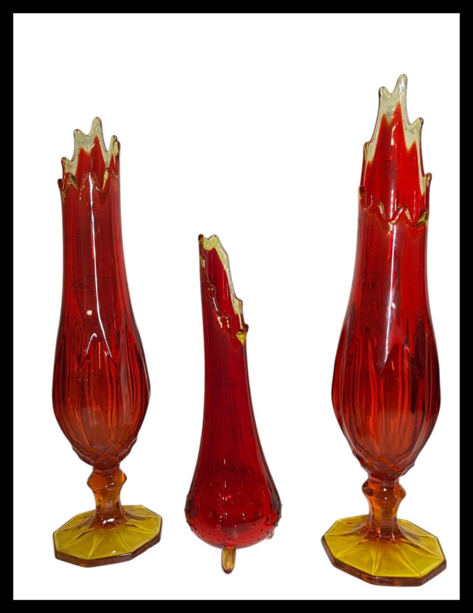 This auction is filled with fabulous art glass beginning with mid century Amberina swung glass vases to vintage Murano and Blenko style classics. However the estate has designer quality throughout with stylish offerings in women's clothing and household designs. Here are a few of the name brands to look for in the catalog. *vintage L.E. Smith amberina swung glass vases vases *Vintage Blenko style hand blow glass ashtray *Viking Bluenique Glas orb lighter and ash tray *Vintage globes and lighted miniatures *Orthoceras and ammonite bowls and goblets *Vintage large Murano fish believed to be Alfredo Bamini *carved teak root bowls...