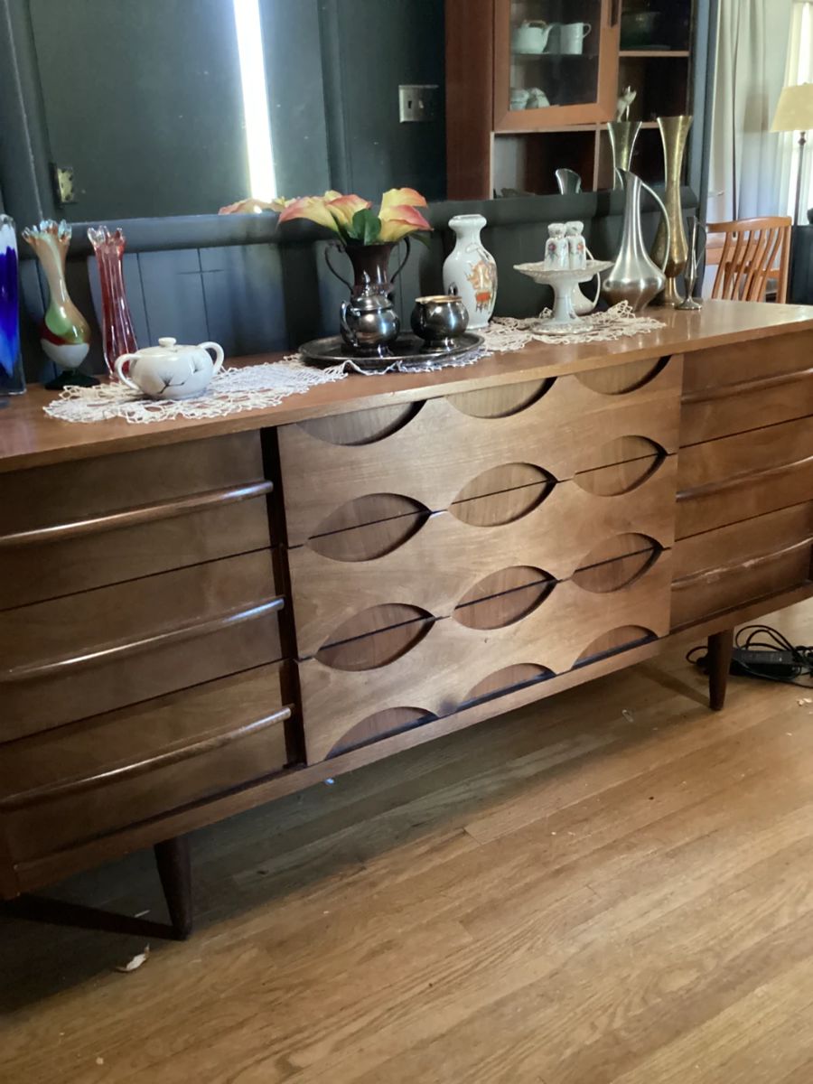 2006 Nissan Altima sedan Kent Coffey MCM dresser and side tables Brutalist walnut buffet MCM lane coffee table MCM dining set MCM teak hutch White leather sectional Black leather MCM style sofa and chair MCM art Women’s clothing MCM magazine rack MCM lamps Murano glass MCM tea cart MCM wood serving pieces Noritake Blue Hill china Crate and Barrel dishes vintage Pyrex MCM enamelware sea shells mink stole linens Crosley record player Snoopy items Audubon bird prints MCM coffee table stain glass TV 14 drawer metal card catalog dolls binoculars perfume Kenmore sewing machine Dooney and Burke handbags books MCM...