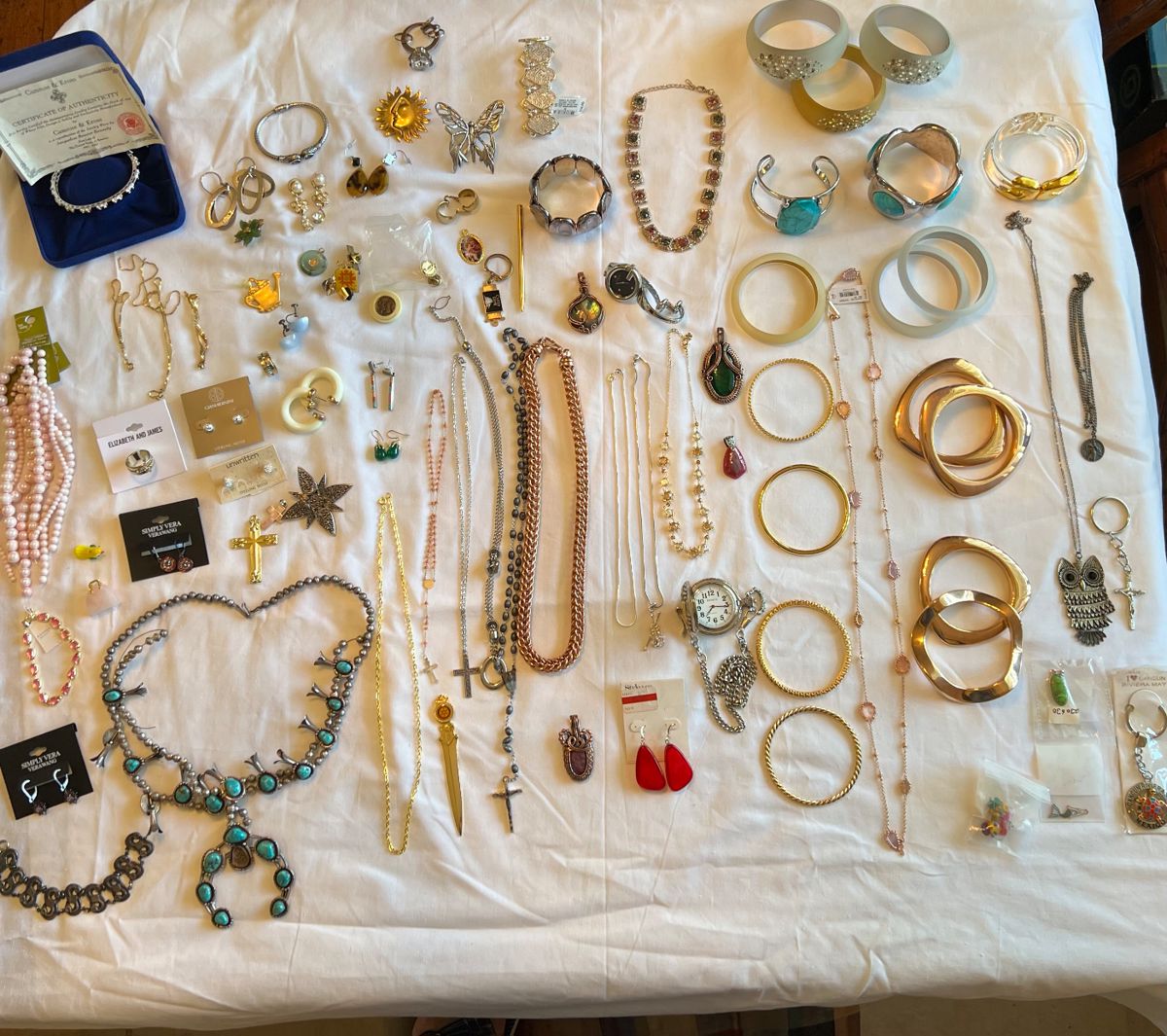 Something for everyone! Jewelry, clothing, furniture, tools, dog stroller, glass ware, shoes, bedroom set, sofa and love seat, coffee tables, small kitchen appliances, silverware, 2 sets of dishes, art work, linens, new bathroom glass tub doors, sewing machine, suitcases, book shelves and so much more.