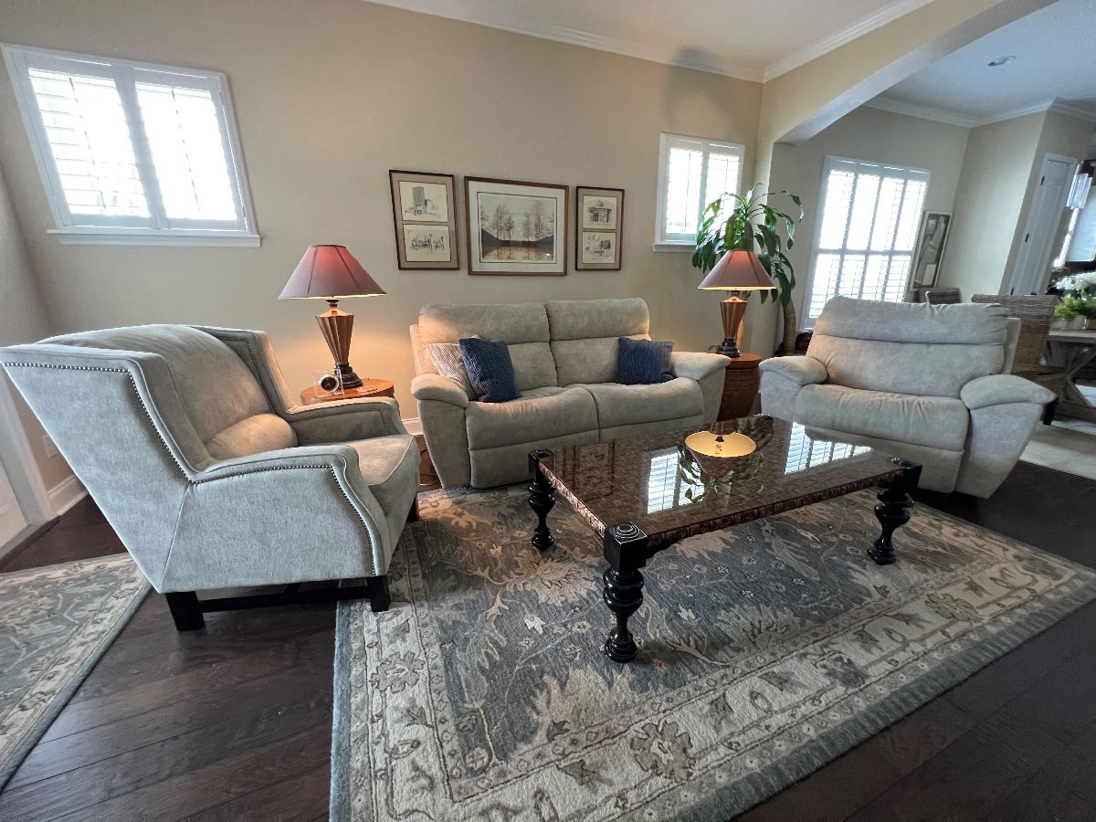 This is a beautiful sale with very nice updated furniture including a reclining living room sofa with matching recliners, cocktail and end tables, Frontgate counter height bar stools, set of six wicker dining chairs, very nice bedroom furniture, a midsize adjustable desk, numerous area rugs, a rattan TV console, a very large wicker floor mirror, two sets of wicker patio furniture including rockers and a pub set and also numerous pieces of very nice accent furniture. Additionally, there is a beautiful Yamaha Clavanova piano, several flat screen TV’s, nice bedroom linens, beautiful potted plants in glazed ceramic planters, handmade pottery...