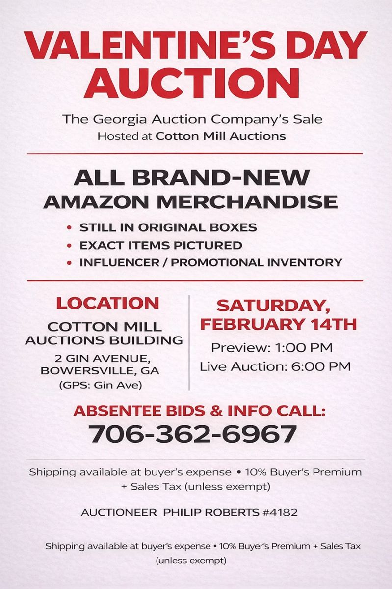 VALENTINE’S DAY AUCTION ALERT!! A Georgia Auction Company Clients Sale Hosted at Cotton Mill Auctions All Brand-New Amazon Merchandise ✔ Still in original boxes ✔ Exact items pictured in comments ✔ Influencer / promotional inventory 📍 Auction Location: Cotton Mill Auctions 2 Gin Avenue, Bowersville, GA (GPS: Gin Ave) 🕐 Preview: 1:00 PM 🔨 Live Auction: 6:00 PM 📞 Absentee bids & info: 706-362-6967 🚚 Shipping available at buyer’s expense 10% Buyer’s in effect unless tax exempt. The Georgia Auction Company Prestige Auctions & Estate Sales Commerce Main Street Cotton Mill Auctions Bowersville, Georgia
