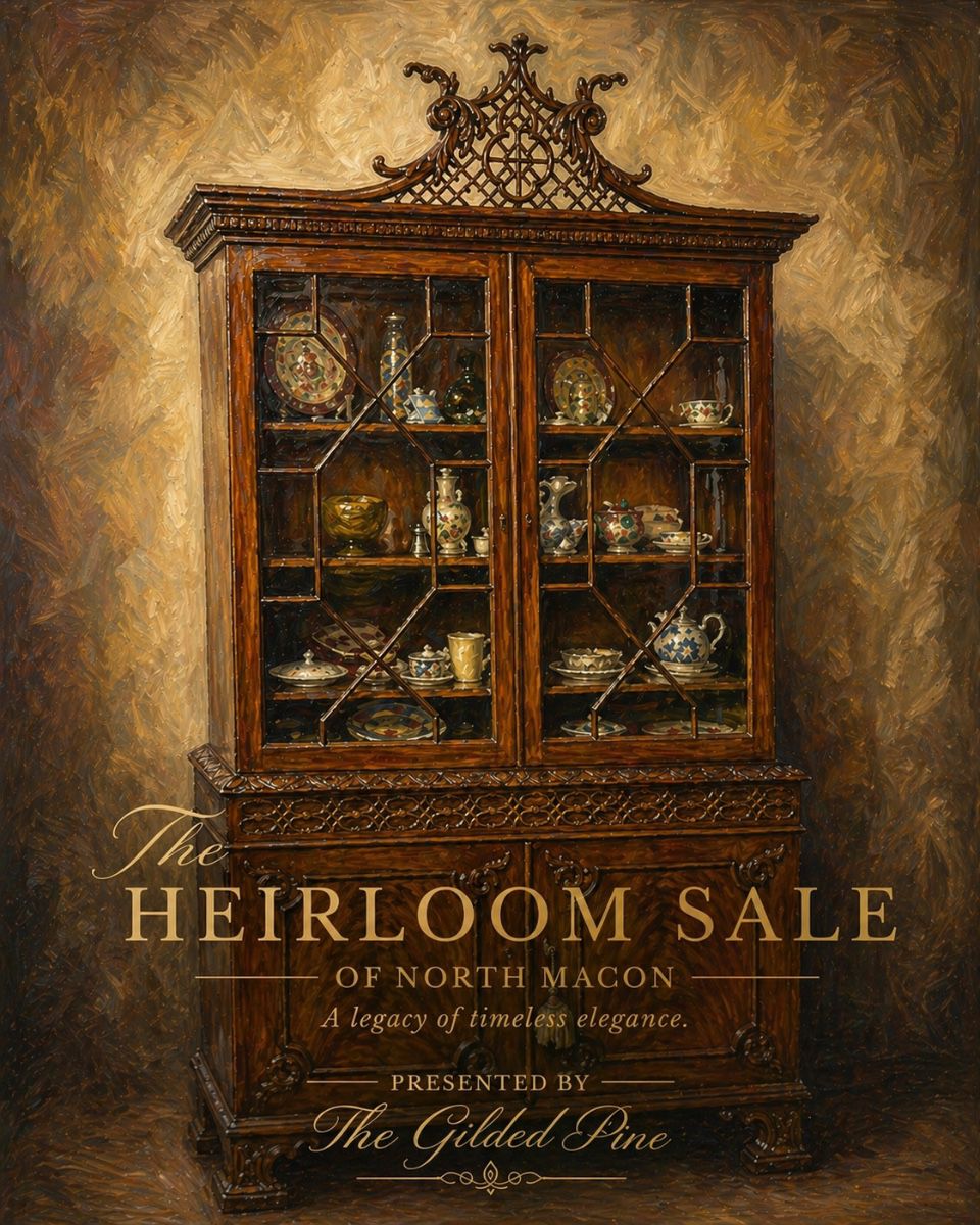 The Gilded Pine proudly presents The Heirloom Sale of North Macon. We are honored to present such an exceptional sale inside a stately North Macon home, thoughtfully curated with timeless pieces of remarkable quality and craftsmanship. Step inside and discover a collection that speaks to true heirloom living, featuring pristine antique furnishings, elegant decor, and refined treasures throughout. Highlights include distinguished Bake furniture, classic Eastlake movement pieces, fine china, and a beautiful 1900s Singer sewing machine. You'll also find a curated selection of books, artwork, outdoor ceramic planters, patio furnishings and much more. This is not your average estate sale....
