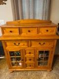 Household: Pine dining table with four ladderback chairs, matching Pine china hutch with glass front and drawers; Beige sofa recliner and recliner loveseat; sofa table with glass top; dark Green uph. sofa with matching chaise lounge and overstuffed chair; glass top end tables and coffee table; floor lamps and table lamps; Four Poster bed with matching dresser and 2 night stands, dark wood; dresser with mirror; 2 jewelry cabinets; jewelry; Lingerie six drawer chest; dropleaf side table; end tables; area rugs; office desk and chair; end table with magazine holder; oak lawyers 4 shelf bookcase; tv and tv stand; 55”...