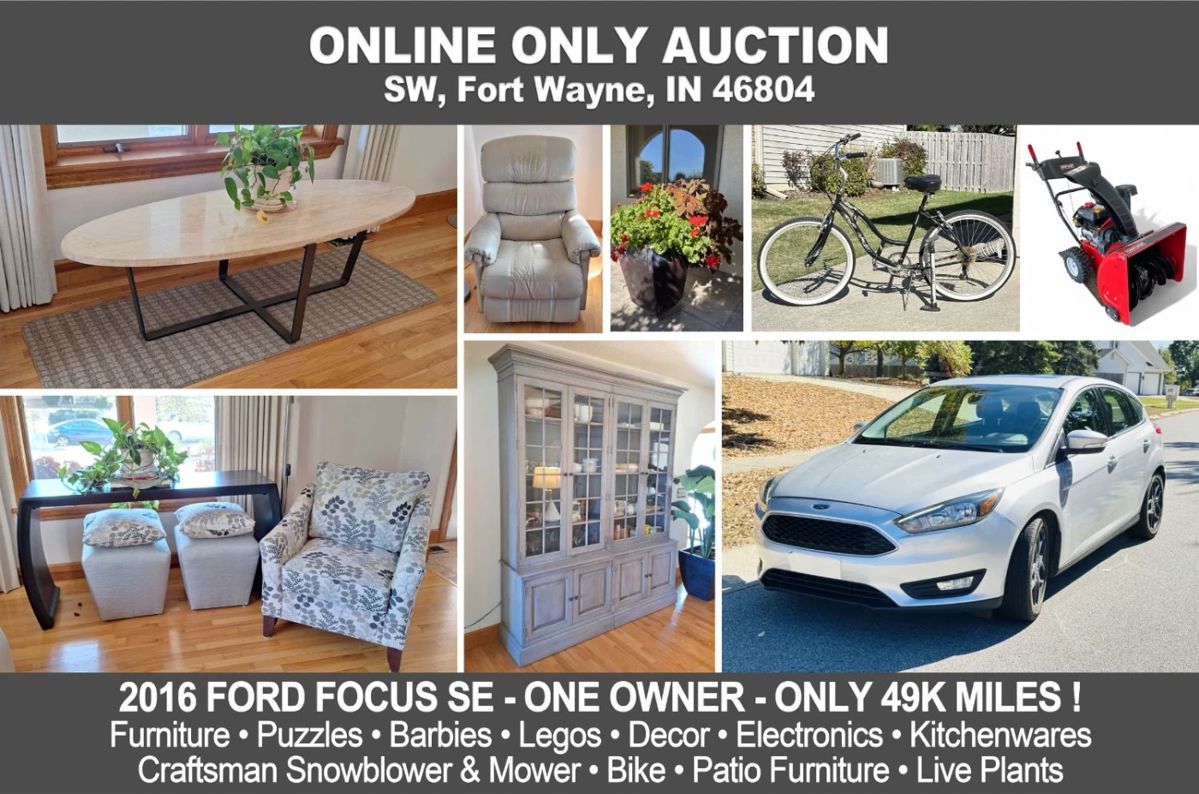 ONLINE ONLY AUCTION *** WE CAN SHIP MOST LOTS *** 2016 Ford Focus SE – ONE OWNER, ONLY 49K Miles, Furniture, Craftsman Snowblower, Craftsman Mower, Kitchenwares, Rolling Kitchen Island, Electronics, Puzzles, Barbies, Christmas Decor, Live Seedum Plants, Patio Furniture, Yard Tools & More. Auction Begins: Saturday, October 11th @ 6:00 PM EST Auction Ends: Monday, October 20th, with first lot closing @ 7:30 p.m. EST WE CAN SELL YOUR COLLECTIBLES – CALL TODAY FOR MORE INFO – 260-441-8636 PICKUP DETAILS • Pickup location: Full Address will appear on winning bidder invoices, Auburn, IN 46706 • Pickup date and time: Wednesday,...
