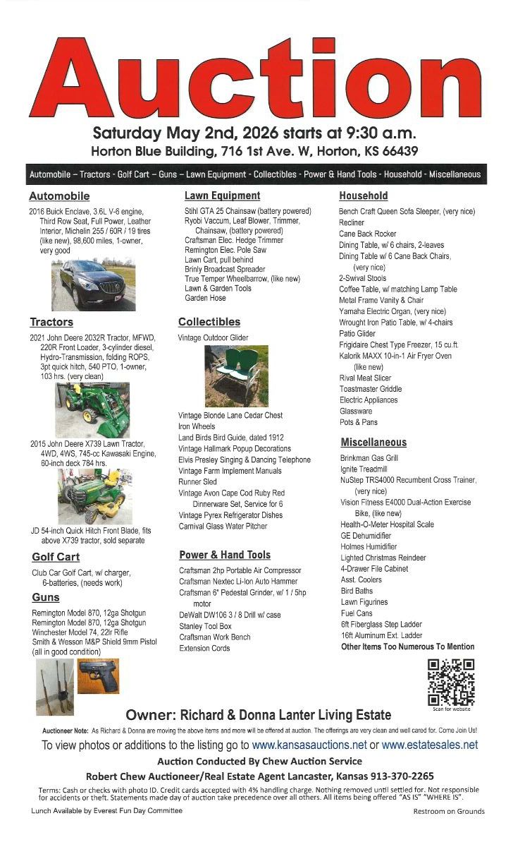 As Richard & Donna are downsizing the listed items and more will be offered at auction May 2nd, 2026 Starting at 9:30 AM. 2016 Buick Enclave, 3.6L V-6 Engine, Third Row Seats, Full Power, Leather Interior, Michelin 255/60R/19 Rubber (like new). 98,600 miles, 1-Owner, very good, 2021 John Deere 2032R Tractor, MFWD, JD 220R Front Loader, 3-cylinder diesel, Hydro-Transmission, Folding ROPS, 3pt, quick hitch, 540 PTO, 1-Owner, 103 hours, very clean, 2015 John Deere X739 Lawn Tractor, 4WD-4WS, 745 Kawasaki Engine, 60 inch deck, 784 hours, John Deere 54-inch Quick Hitch Front Blade fits above X739 tractor, sold separate. Club...