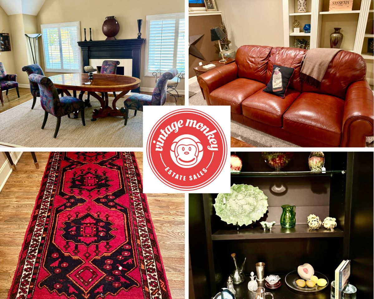 Follow us on instagram: @VintageMonkeySales FURNITURE Lane leather 3 cushion sofa, Sherrill custom upholstered chair w/ ottoman, 2 matching cheetah chairs w/ ottomans, small table made with horn legs & horn tile top, 3 piece shelving unit- glass front cabinet, media cabinet, bookshelf w/ cabinet, small side tables, small secretary desk, solid wood 3 drawer console, several barstools, 3 metal chili pepper barstools, Bedroom set- King 4 poster bed, long dresser w/ mirror, night table- by Lineage, Maitland Smith 4 bottle wine cooler, Henredon Regency cherry & Burled wood double pedestal dining table, set of 8 upholstered dining chairs, pin...