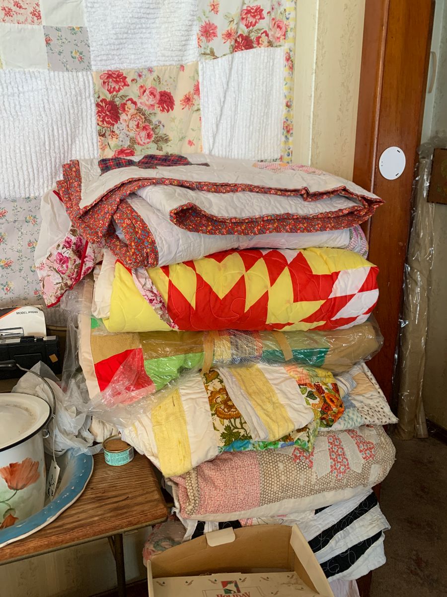 Vintage quilts, Ladies Size 10 Designer Shoes, Dressers, Mirrors, Ladies Clothing, Furs, Furniture, Vintage Ashtrays, Crystals, Vintage Christmas Decorations, Jewelry, Vintage Lamps, Pots and Pans, Vintage Chairs, Albums, and Garage/Shed Items