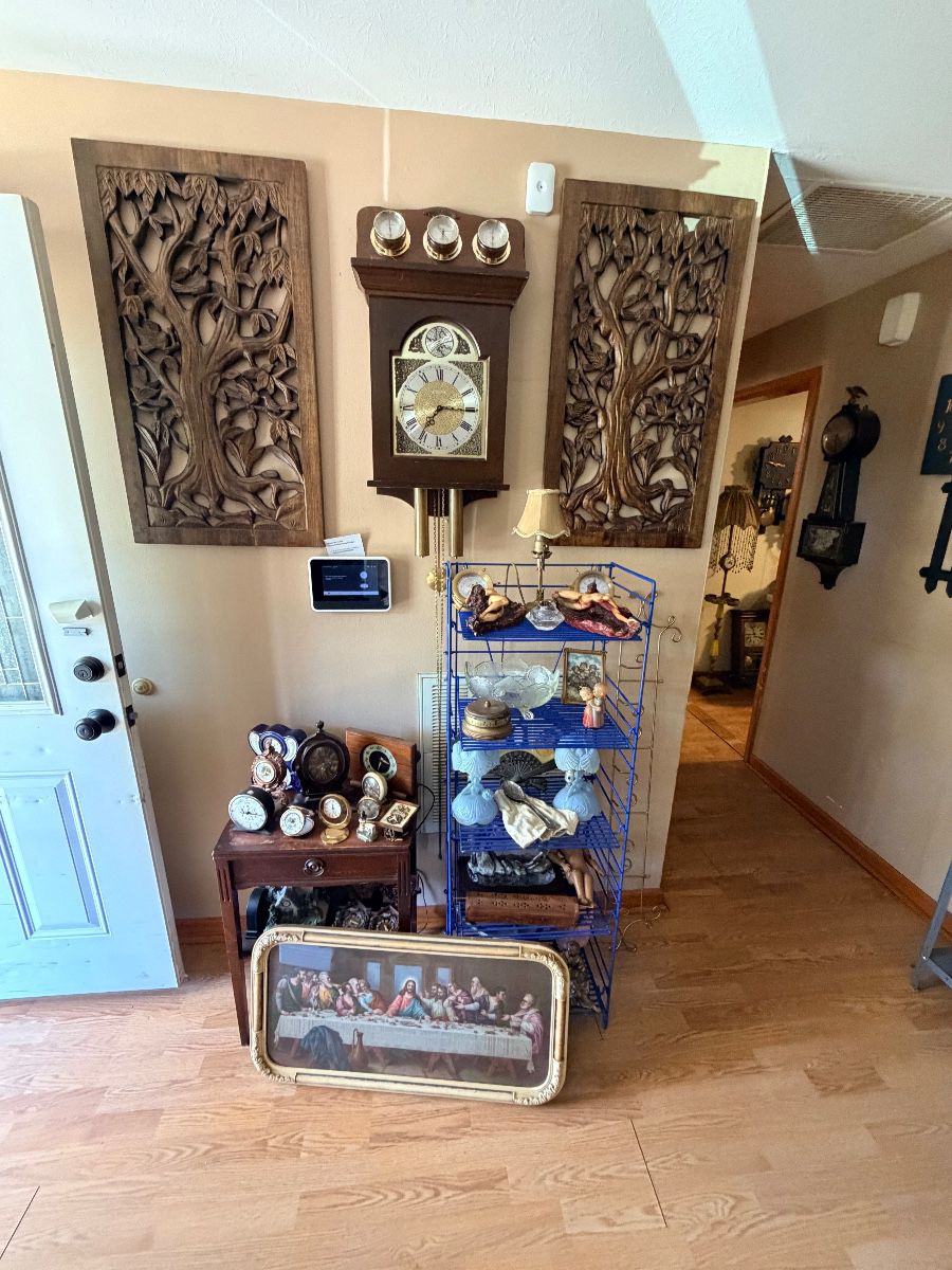 Sunday 50% off sale. Antique Clocks, lots of fishing equipment, loads of fishing lures, rifle and gun cases, gun cabinet, gun safes, battery operated wheel chairs, Dale Earnhardt collectibles, several different antique and signed pictures, several antique records, over 50 different pocket knives, lots of hunting gear, wine making kit and bottles/jugs to put wine in, king size adjustable bed, shotgun shell reload equipment with buckets of empty shotgun shells and hulls, antique China, antique furniture, antique music boxes, vintage collectible plates, small tool box, loads of loose tools, Barber chair, leather making tools and equipment, kids scooters, poker tables...