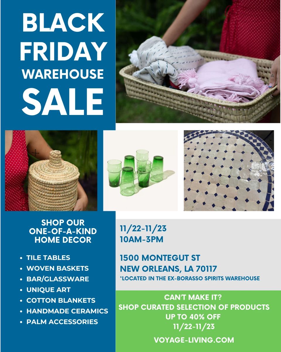 πŸ›οΈ Early Black Friday Warehouse Sale πŸ“… Saturday, Nov 22 & Sunday, Nov 23 ⏰ 11:00 AM – 3:00 PM Step into a world of craftsmanship and culture at our Early Black Friday Warehouse Sale! ✨ Discover one-of-a-kind treasures: Handblown recycled glassware, Hand-painted ceramics, Hand-tile bistro tables, Handwoven storage & laundry palm baskets, Hand-loomed pom pom blankets & pillow covers, 🌍 Every piece is ethically sourced from talented artisans in Morocco, Senegal, and Colombia. πŸ‘— Special pop-up: Catahoula Collection will be joining us with a curated rack of vintage clothing finds. πŸ’» Can’t make it in person? Shop online at...