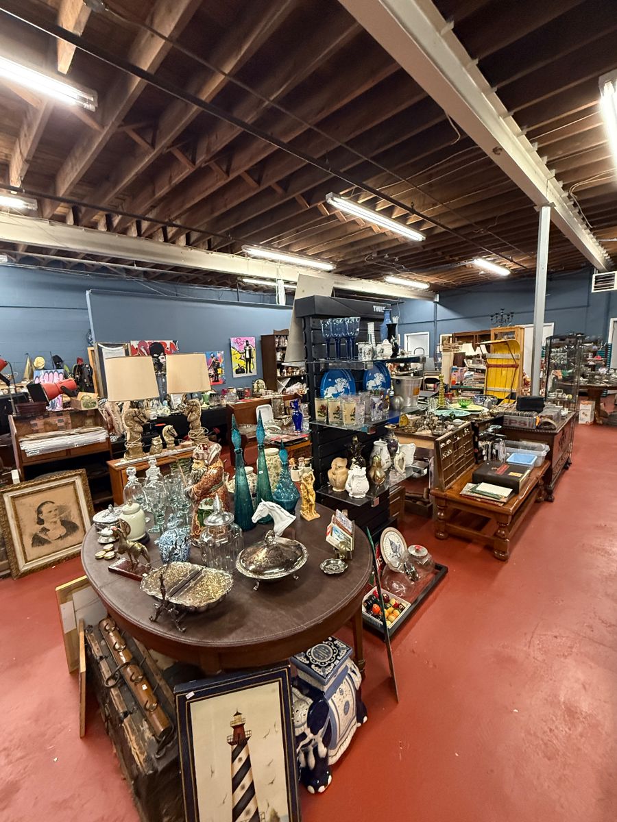 Tons of items. Glassware, vinyl records, sports memorabilia, and cards, antiques, collectibles, furniture, store displays and so much more.
