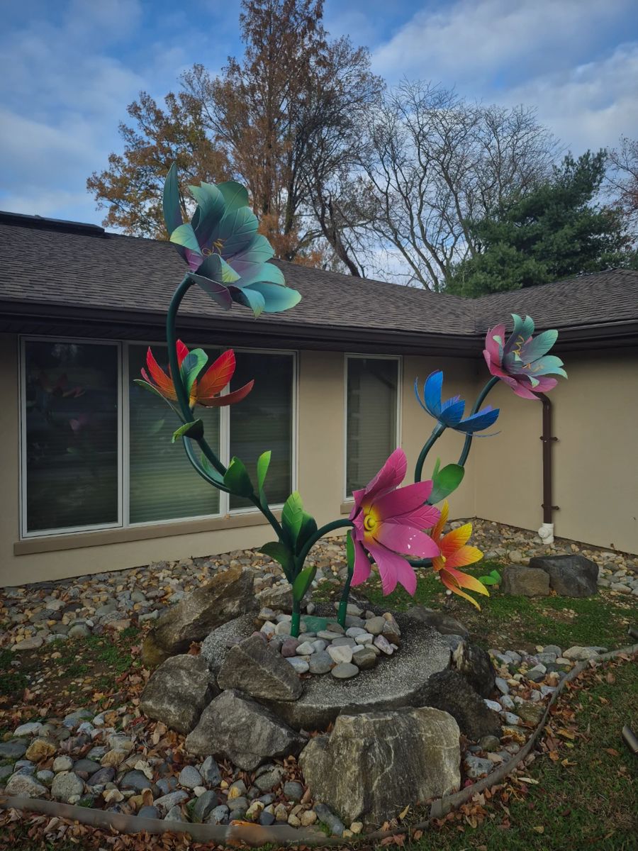 Golden Egg still has these amazing pieces available! Commissioned industrial art. Hand crafted by area artist studio. We had a buyer but due to moving parts on the buyer's end the sale fell through. Don't miss this opportunity! We do know there were other interested parties. All art stands approximately 8 ft tall. Sculptures are intact with an exterior paint finish with few area that buyer may choose to touch up. Original commission was upwards of 25k. Selling 2 matching pieces @ $750 ea. Large "bouquet " is listed for $1450. The matching pieces are bolted to movable concrete base....