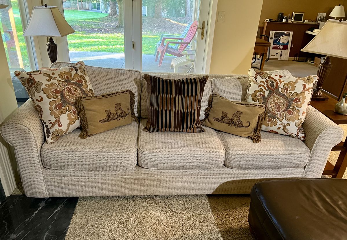 Tastefully decorated with quality furniture, home decor and kitchen, office, den and bedroom furnishings. Lower level workshop and 2-stall garage provide lots of tools and machinery to select from. two comfy couches, lovely, maintained dining table and 6 cushioned chairs, ottoman with cover to hold a fav blanket, pillows of subtle shades and throws, perfect side table with hidden extention for dining, glass bistro table with two chairs, glass and green wrought iron side table, sofa table to display or catch-all, tall bookcase / entertainment center, king bed and like-new mattress/box spring, two matching side tables, smart smaller hide-away desk...