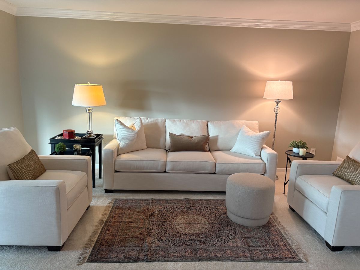This home is immaculate - clean - clean - clean! Furniture is fabulous and current! Housewares are in style and perfect for everyday living - from Crate and Barrel, Pottery Barn, Le Creuset and more! Furniture: Ivory couch, Matched set of Ivory chairs - Pottery Barn, Side tables - wood and metal, wood nesting tables, Leather recliner, 8 performance linen dining chairs, Printer cabinet, two-drawer wood filing cabinet, Grand-father clock, Swivel Bar stools with back - black metal and ultra suede, Round maple table with black wood chairs, Dressers, Nightstands, Leather club chair, Armchair, Media Cabinet, Black Console table, Teak...
