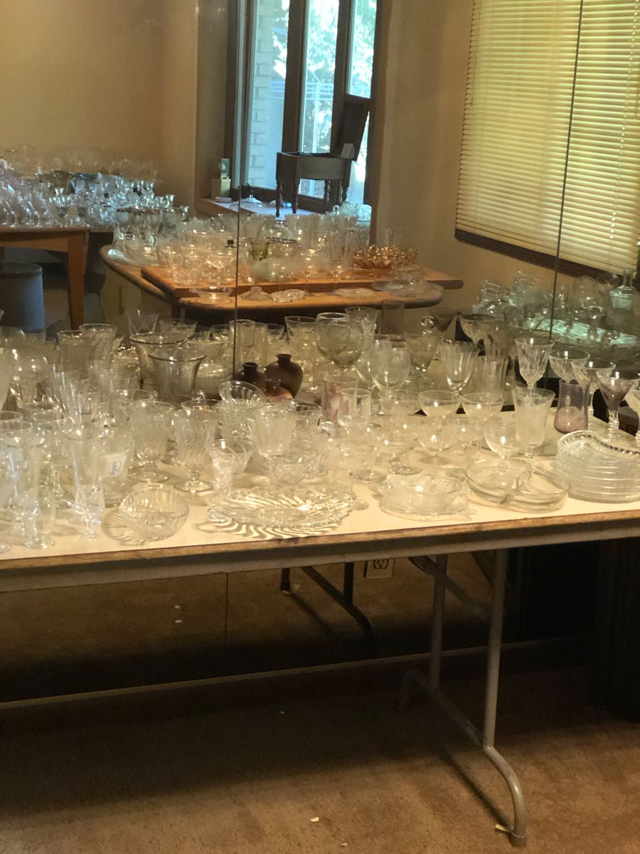 A lot of glass mostly Fostoria. Some display cases and marble bistro table and chairs.