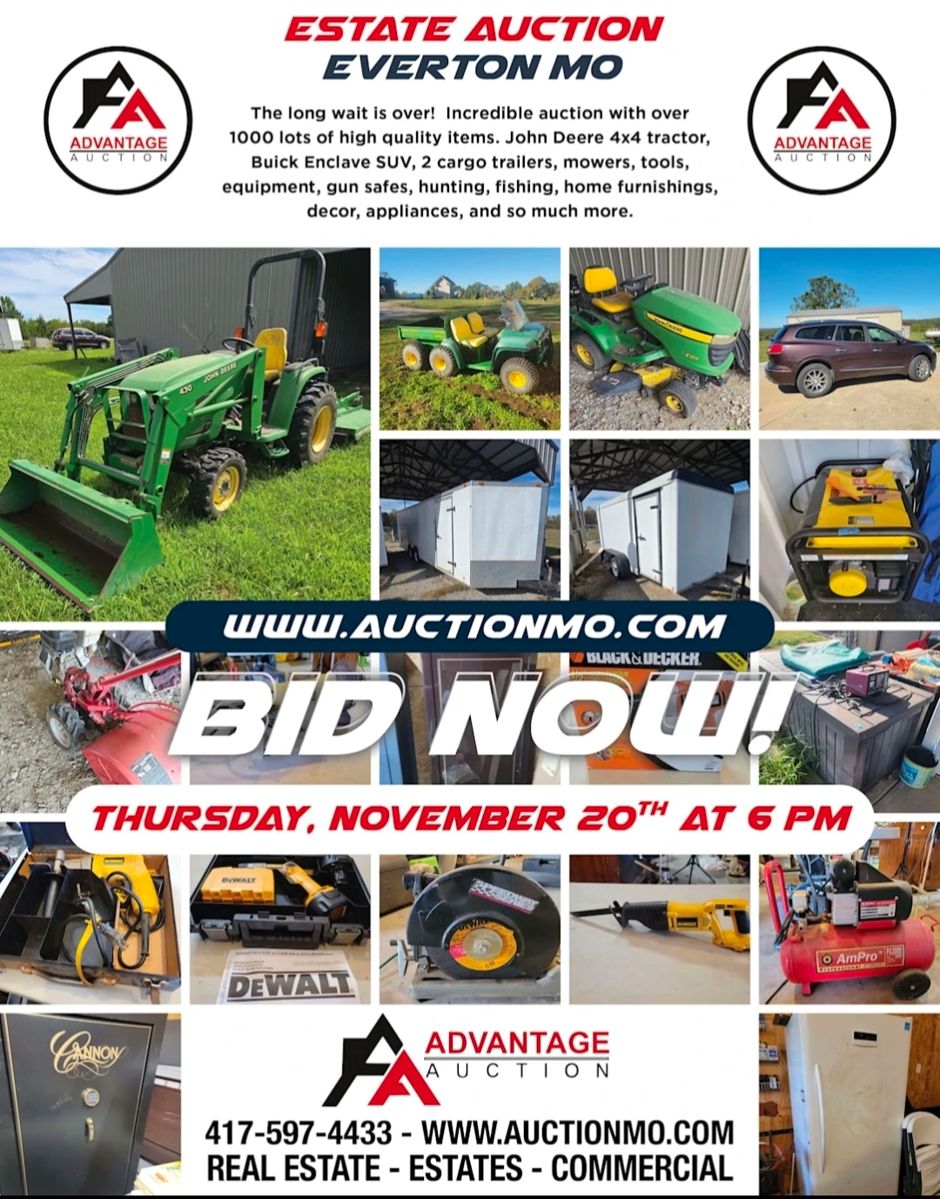 Copy and paste this link, AuctionMO.com . The long wait is over! Incredible auction with over 1000 lots of high quality items. John Deere 4x4 tractor, Buick SUV, 2 cargo trailers, mowers, tools, equipment, gun safes, hunting, fishing, home furnishings, decor, appliances, and so much more