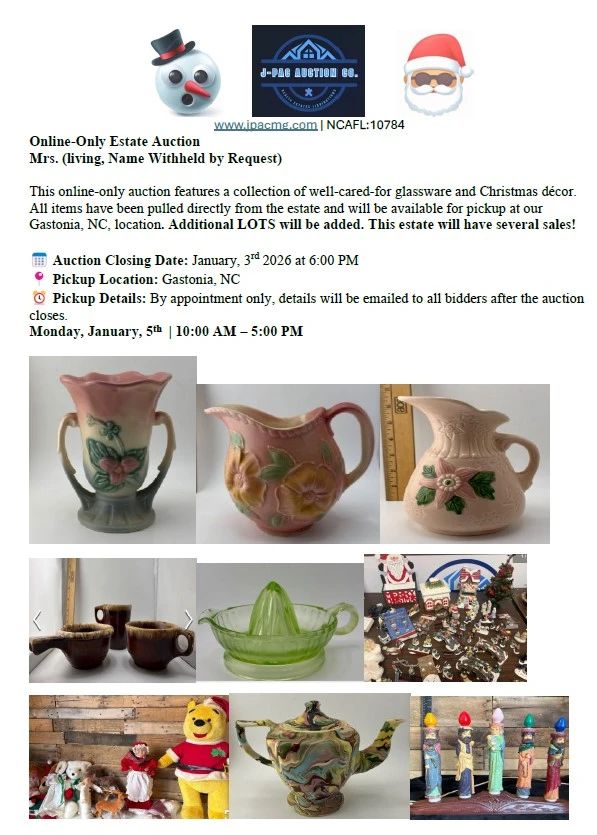 Online-Only Estate Auction Mrs. (Name Withheld by Request) This online-only auction features a collection of well-cared-for glassware and Christmas décor. All items have been pulled directly from the estate and will be available for pickup at our location in Gastonia, NC . *** ADDTIONAL LOTS WILL BE ADDED** This is a multiple sale estate, and we will add more item in the coming days. 📅 Auction Closing Date: January 3rd 📍 Pickup Location: Gastonia, NC ⏰ Pickup Details: By appointment only Monday, January 5th, 2025 | 10:00 AM – 5:00 PM www.jpacmg.com | NCAFL:10784