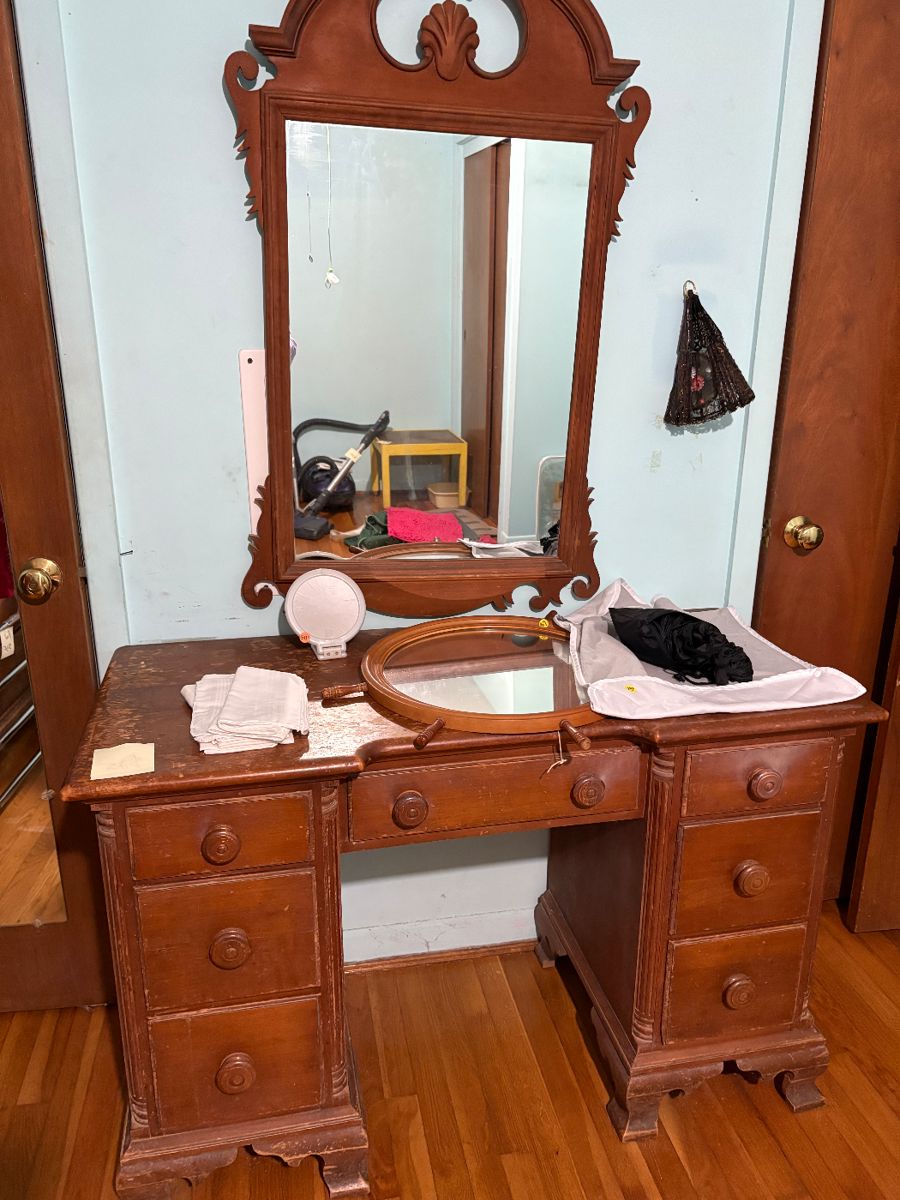 Book cases, sofas, chairs, bed frames, books by multiple authors, dishes, table and chairs (seats 8). Many stuffed animals. Dressers . Howard Murray print.