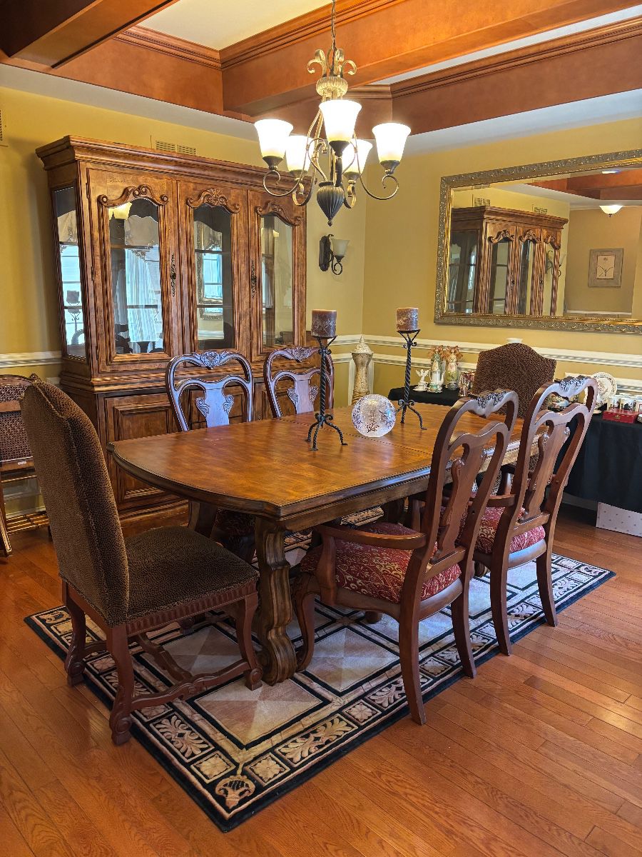 Formal Traditional Dining Room w/4 Arm and 2 Armless Chairs Formal Traditional Sideboard Traditional Sideboard King Size EASE Double Adjustable Bed Black Painted Farm Table w/4 Windsor Chairs Ornate Mirrors 3 Cushy Sofas! 3 Bedroom Sets Dressers and Nightstands Coffee and End Tables Traditional Desk and Leather Chair Rugs Paintings and Prints Vega Banjo style K 53884 Michel Delacroix Lithograph Lamps Pair of Chaises 2 Basset Leather Chairs 1 Broyhill Leather Chair Brand New Faux Leather Lift Chair from Macys-Never Used! Books including set of Atlantic and Southern Reporters Princeton Memorabilia Pair of Oars Home Decor Pewter Figurines Hummels Venetian...