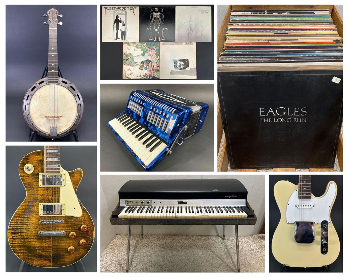 Fall Music, Instruments & Equipment 500 lots ~ 3 Local Collections ~ One Remarkable Auction Over 70 Acoustic & Electric Guitars ~ 16 Bass Guitars ~ Kay Upright Bass Fender Steel Guitar ~ Banjos ~ Mandolins ~ Violins ~ Horns incl. Saxphones Trumpets Accordions ~ Drums ~ Keyboards ~ Vintage Kustom K-100 Amp Head & Speakers Amplifiers ~ Accessories ~ Stereo Components ~ Speakers ~ Radio Tubes Sound Boards ~ Moog Polymoog Synthesizer ~ Fender Rhodes Stage Piano Over 1,200 Record Albums ~ Over 900 Music CD's & Much More! All sells - no minimums or reserves - see it...