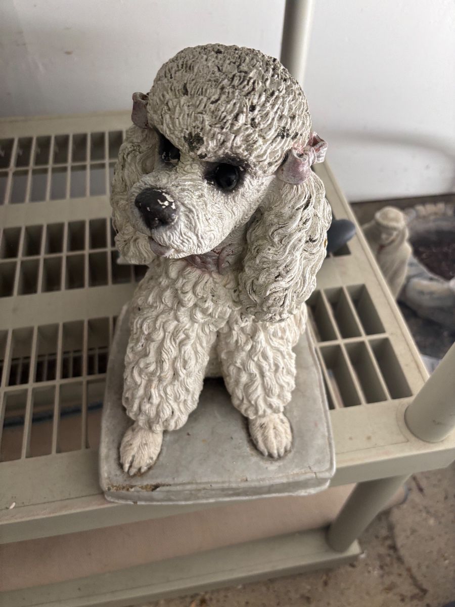 Great yard statues and planters, coffee table, queen bed, dining room table, beautiful display cabinet, china cabinet , set of china, great make up vanity with stool, plant stands, shelves, kitchenware, outdoor cement deer, statues, concrete bench, bird bath garage items and more