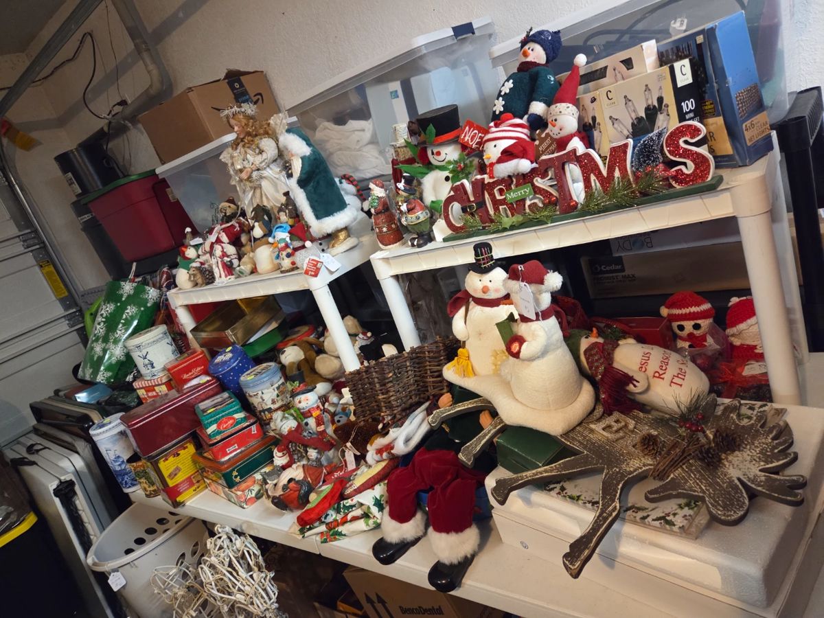 There is lots of Disney, cherish teddies, painted ponies, Hallmark, Jim Shore, Dept 56, lots of Christmas, luggage, books, lamps, pictures, frames, purses, scarves, bags, plant items, knomes, outdoor items, vintage reel cases, baseball cards, sports memorabilia, snowblower, edger, hose reels, hats, garden items, mugs, kitchen, bath items, yarn, needlepoint, crafts, Sooner items, hats, candles, CD's, Games, game hint books, VHS, records, tapes, 8 track, DVD'S, jewelry, Disney, Sooner, Thunder, woman clothes and shoes, mens clothes, kids clothes, and so much more.