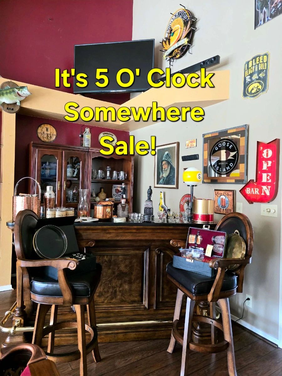 We are so excited to announce that our It's 5'O Clock Somewhere sale opens tomorrow, Thursday, March 26th at 10am!!! It promises to be a fun event with happy hour Thursday and Friday from 3:00-5:00 featuring fun surprises! So grab a friend and come join us! This sale features a wide variety of items including a game room with collectible signs, a Cheers bar, pool table, novelty barware, golf-themed decor and books, MCM bedroom furniture by Henredon, traditional furniture throughout, nice outdoor wicker furniture, vinyl albums and CDs, elegant dinnerware by Lenox, crystal serving pieces including an extra-large punch bowl...
