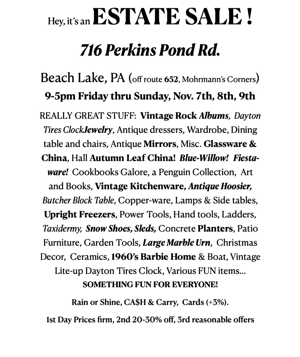The address for this sale in Honesdale, PA 18431 will be available after 9:00am on Thursday, November 6th, 2025. Dates