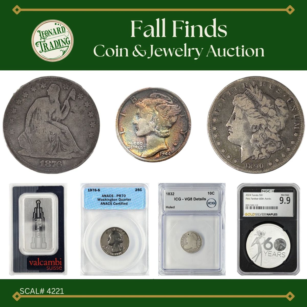 Fall Finds: Coin & Jewelry Auction Auction is Live from: 10/14-10/21 Lots start closing at 8:05pm EST on Tuesday, 10/21 Join us for the Fall Finds: Coin & Jewelry Auction featuring an impressive selection of coins and a stunning array of fine jewelry pieces. Don't miss this exciting opportunity to acquire rare collectible coins and beautiful jewelry pieces! Pickup is available in Greenville, SC on Wednesday, 10/22 from 3:00pm-5:00pm. Shipping is also available on most items. Bid now to enhance your collection! Featured Items include: 1890-CC & 1891-CC Morgan Silver Dollars - Carson City Mint! ICG 1832 VG8 Silver Capped...