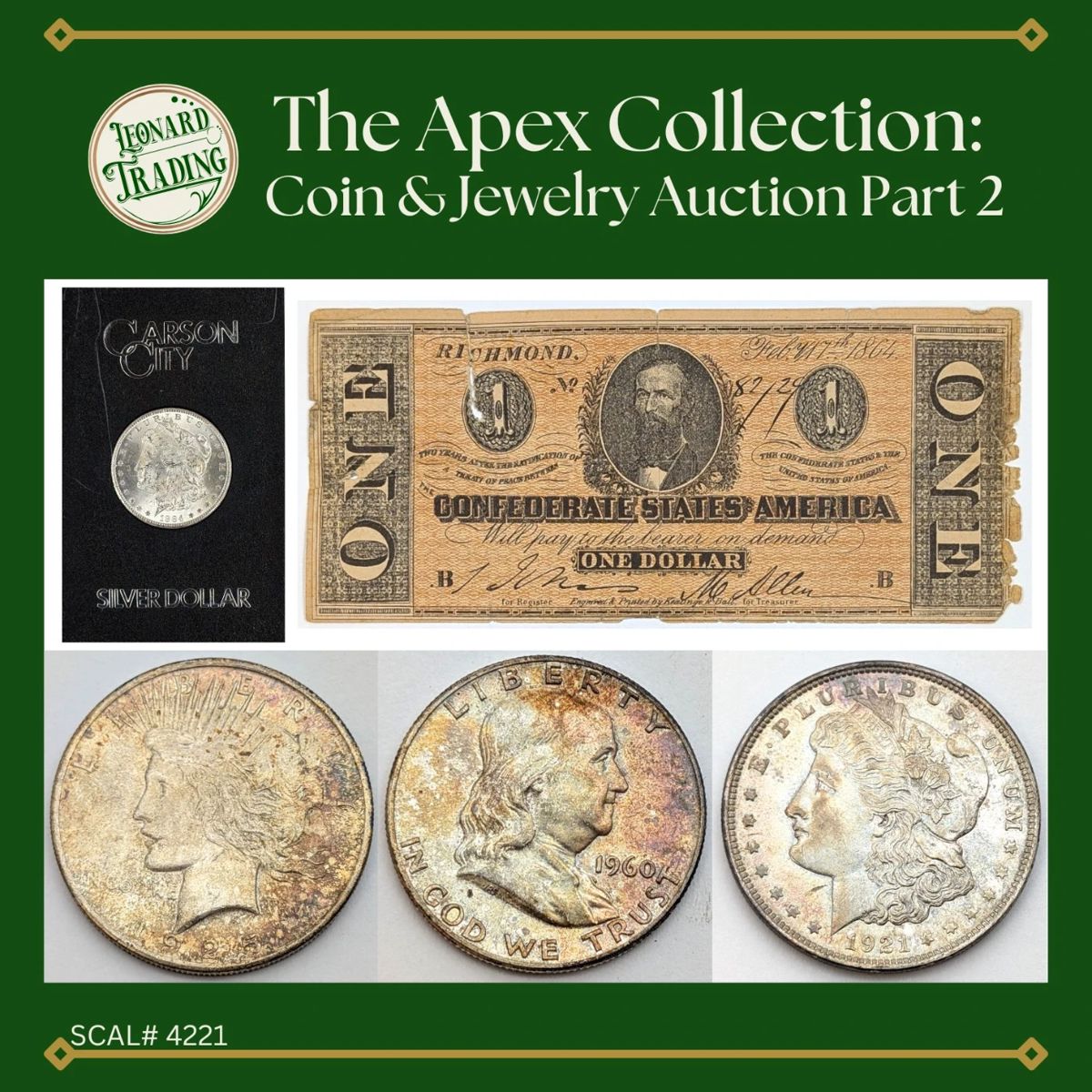 The Apex Collection: Coin & Jewelry Auction Part 2 Auction is Live from: 11/18-11/25 Lots start closing at 8:05pm EST on Tuesday, 11/25 Join us for The Apex Collection: Coin & Jewelry Auction Part 2 featuring the curated collection of a lifelong coin collector, this auction showcases high-end coins and currency from across the United States. Highlights include rare U.S. notes like an 1864 Confederate States of America $1 Note—alongside a stunning array of toned coins featured in Part 2 of this auction. We will still include everyone's favorite collectible US Coins and some fine jewelry as well. Pickup is...