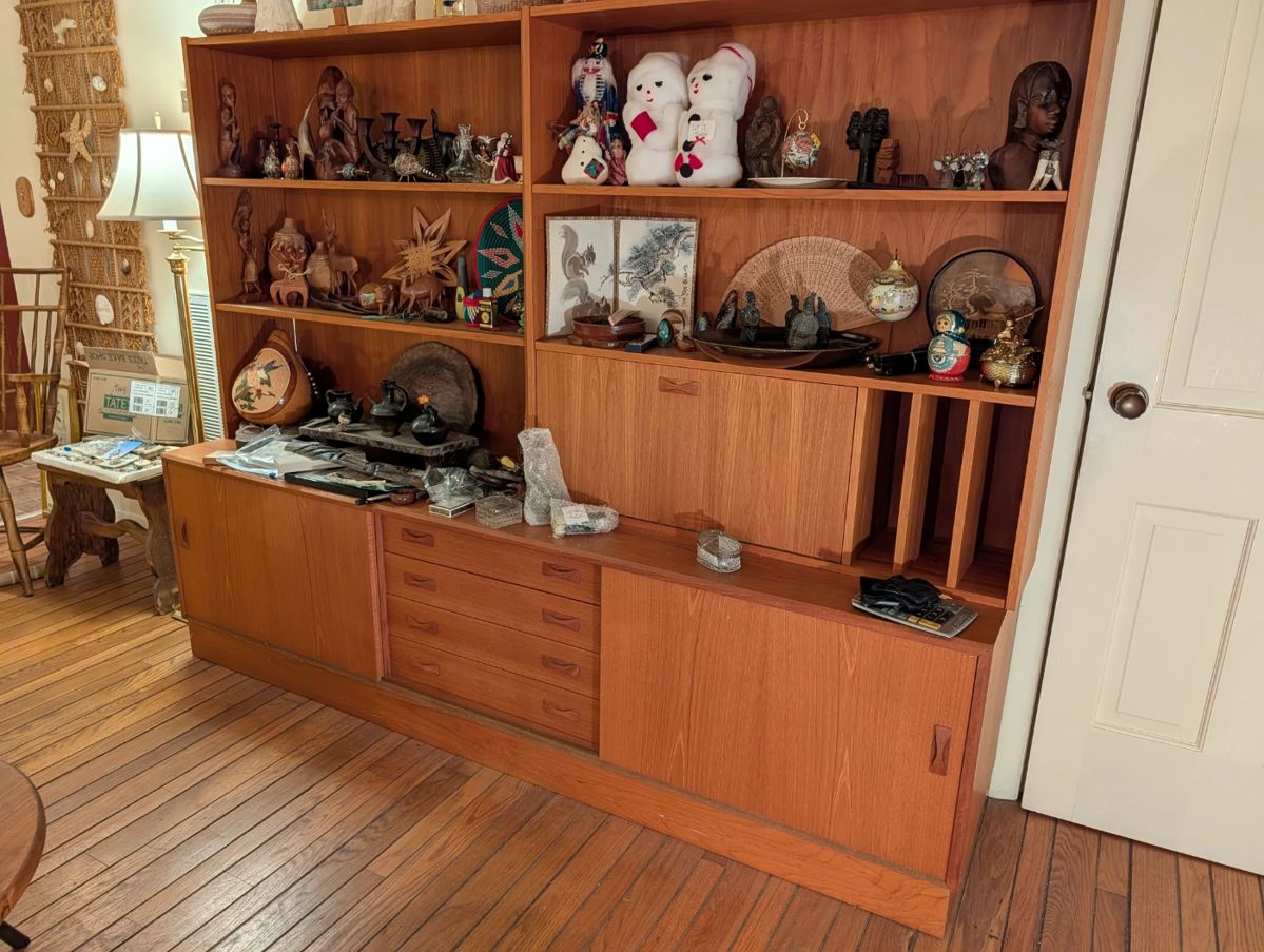 Upright freezer, refrigerator, stove, washer and dryer. Large mid century sliding door cabinet, pair of twin beds, king size bed, medical equipment, bamboo sunroom sofa, chair and tables.