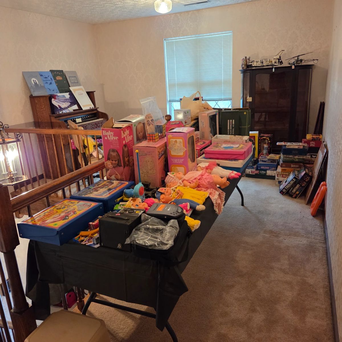 Lots of items, too much to list. Christmas items, Antique Glassware, Antique Trinkets, LOTS of Books, LOTS of picture frames, Oil Paintings, Lithographs, CD's, DVD's, Blue Ray, Handmade Quilts, Vintage toys with the boxes, Antique Dolls, Kitchenware and small kitchen appliances, Crystal Glassware, Fine China, 2 Upright Organs, Bath Towels, 1920's Curio Cabinet, Dining table seats 10, maybe 12, China cabinets, Misc. Furniture, Board games, Willow Tree figurines, Closet full of new Mary Kay items, Costume jewelery, Men and Women clothing, Lenox Collector Plates and other misc collector plates, We will also have a "Bin-anza" type of room with small...