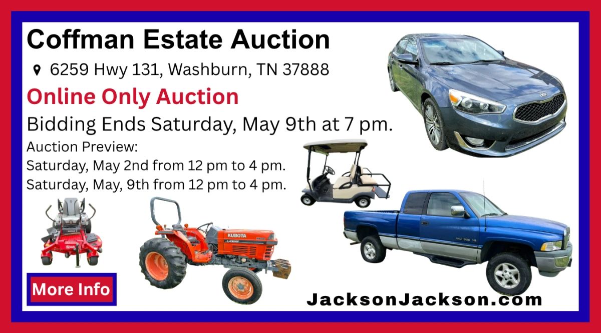 Coffman Estate Auction ONLINE ONLY We are pleased to present a massive estate auction featuring the lifetime collection of the Coffman family. This is a true “something for everyone” sale with over 800 individually numbered lots spanning furniture, antiques, collectibles, household goods, tools, outdoor equipment, vehicles, and much more. The auction includes: Coins and Jewelry Furniture & Home Furnishings • Multiple sofas, recliners, dining sets, bedroom suites, bookshelves, cabinets, desks, and side tables • Oak pedestal dining table with carved chairs, mission-style recliner, leather executive chairs, and more • China cabinets, dressers, nightstands, vanities, and entertainment centers Appliances & Electronics...