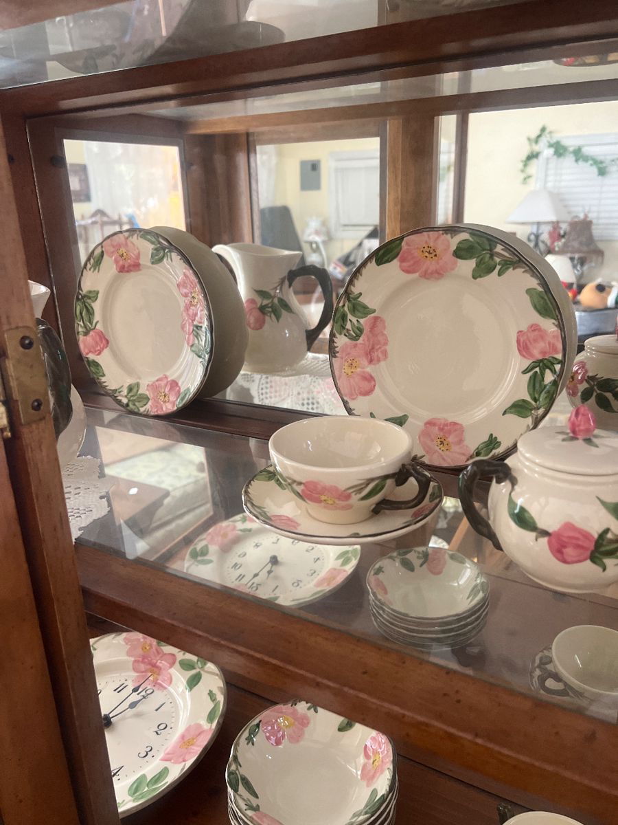Washer & dryer, refrigerator, oak dining sets, china hutches, vintage sofas, Baby Grand piano, Baldwin piano, 1936-37 Gibson Guitar,Antique iron work bed, Antique vanity, French Provincial bedroom furniture, wingback chairs, desks, antique portable singer, antique Singer machines in cabinets, Montgomery Ward stereo console cabinet, antique vanity, Hen on a nest,John Beams special “ Cold Hearted SOB electric guitar, side tables, sofa tables, Waterford, crystal, Fenton, Uranium glass, depression glass, PYREX, Tiara, Corningware, cast iron skillets, Fire King, Pfaltzgraff, Viking glass, GWTW lamps, vintage dolls, including Barbies, China including Limoge, Franciscan Desert Rose set, tea cup collection, vintage jewelry, area rugs,...