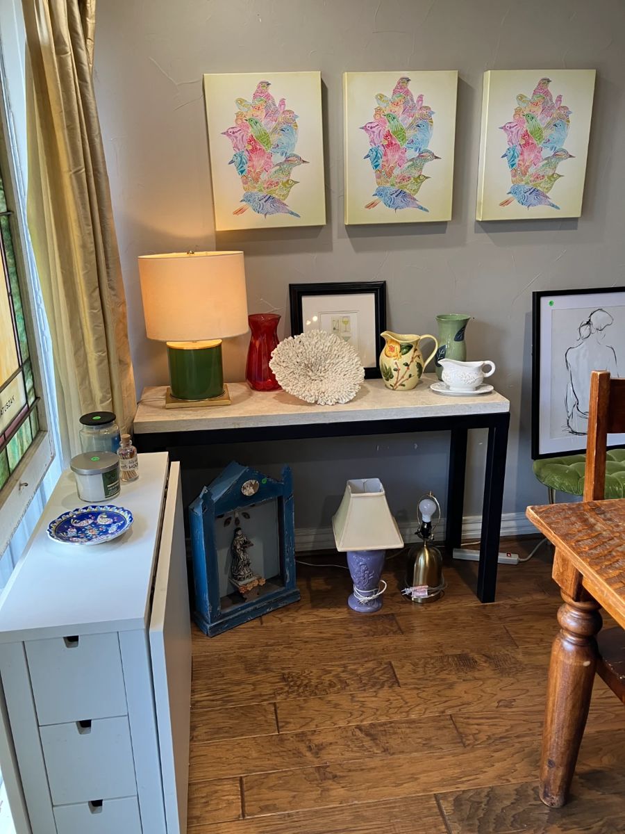 So much to see in this home full of eclectic treasures! Beautiful furniture, lots of Mid-Century Modern decor, unique artwork, Legos, multiple stained glass pieces, Halloween costumes, kitchenware, stainless steel refrigerator, patio furniture and items, bird bath, unique children's swing, costume jewelry, women's clothing and more!