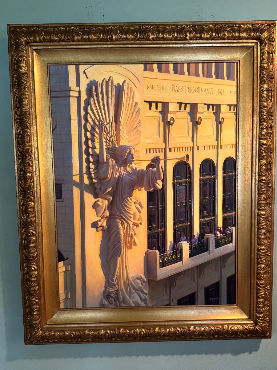 This is a beautiful sale. The house is an art gallery. There are more than 75 paintings, sculptures, or bronzes. The following artists are represented: Rascoe, Tennison, Srebnik, Brough, Jansen, Timothy Tyler, Davenport, Escobedo, Kang Cho, Walter Matia, Aleksi, E. S. Hardy, and more., an exquisite series of large watercolors depicting Bible stories, large painting of a corner of the Bass Hall, sofa upholstered in a lovely green weave, side chairs, dining table and chairs, buffet, breakfast table and chairs, unusual wing chairs....all these pieces are freshly and beautifully upholstered in fine fabric, Baldwin grand piano, upright piano upstairs, numerous...