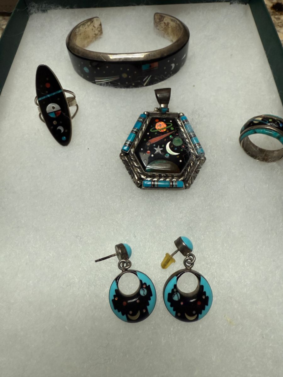 Living Estate Sale of a world traveler. Come shop for Christmas Presents, Wonderful large collection of Native American Jewerly. Many signed pieces. Some Avery, Brighton, enamel pieces, misc. costume jewelry, probably over 100 pairs of earrings very large Spurs Jewerly and other collectors items, wooden and metal shelves, books, VHS, Large Cross collection, Russian limited edition signed print, Longaberger baskets, cat collection, Christmas items, Fiesta flatware, wooden bowls, Carved Olive Wood Holy Land pieces, a few dolls, Pinocchio, Antique Stereoscope and large collection of cards including Cotton is King with slaves, Theodore Roosevelt, children's, and more, Like New Trec Marlin...