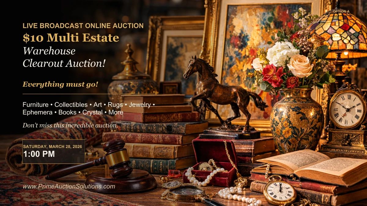 $10 Multi-Estate Warehouse Clearout Auction | Everything Must Go! Live Broadcast Online Auction Sunday, March 29, 2026 at 5:00 PM Don’t miss this exciting Multi-Estate Warehouse Clearout Auction featuring a diverse selection of merchandise from multiple estates and warehouse inventory. From furniture, collectibles, art, rugs, jewelry, ephemera, books, and more, this auction offers something for collectors, decorators, resellers, and bargain hunters alike. With bids starting at just $10, this is a fantastic opportunity to bid on a wide variety of interesting and desirable items while everything must go. Join us for this Live Broadcast Online Auction and bid from anywhere...