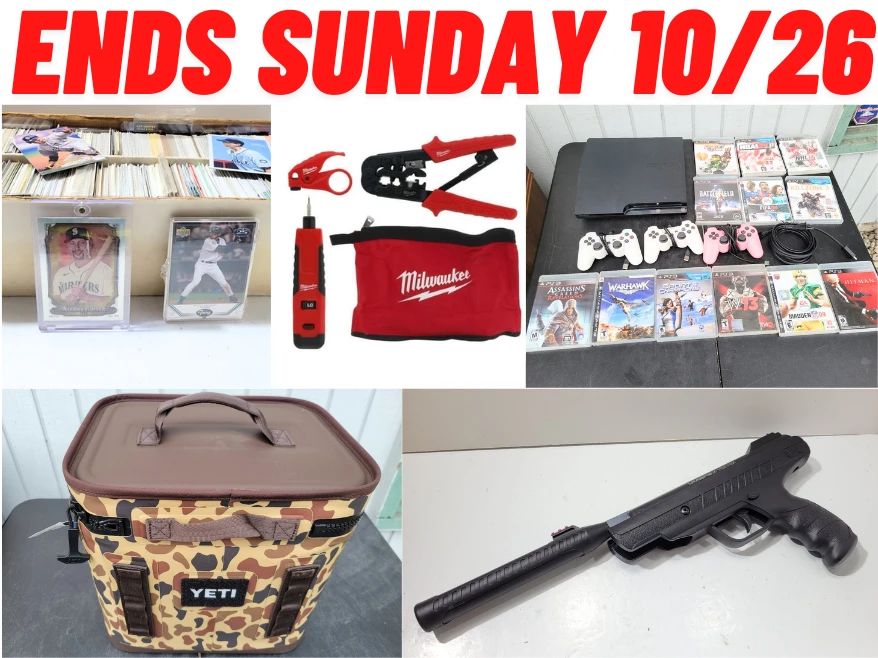 This auction features: Pelican Case, String Lights, Pellet Gun, NEW Tools, Tabletop Grill, L-Shaped Desk, Lounger, Automatic Watch, Off Grid Shower, Refrigerators, NEW Toys, Video Game Consoles, Coolers, Ladders, Pillows, Sheet Sets, Currency & Coins, Pneumatic Tools, Card Lots, Store Returns, DVDs, Knives, Board Games, Hunting, Plumbing Accessories, NEW Toys, Electrical Tools, Binders of Trading Cards, Shoes, Clothing, Assorted Sports Cards, Beer Collectibles, Camping, Wall Art, Home Décor, Books, NFL Items, Video Games, Coin Banks, Kitchenware, Dishware, Collectibles, Action Figures, Toys, Hand Tools, Power Tools, Fishing Reels, Sports Cards, Magic Cards, Pokémon Cards & Much More! To bid head to...