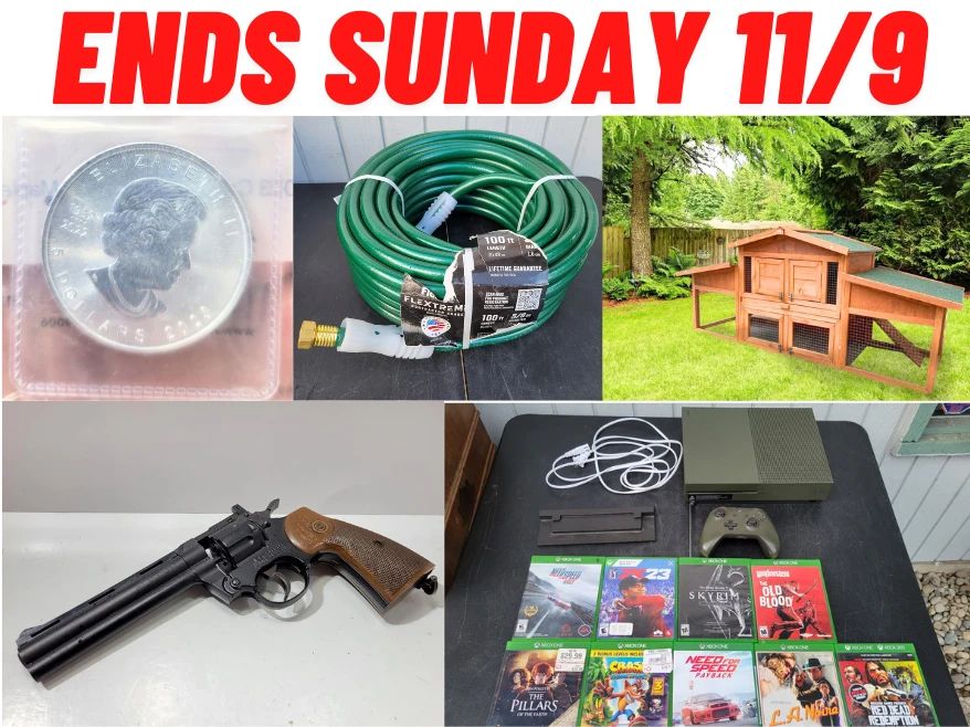 This auction features: Silver Coins, Chicken Coop, Bounce House, E-bike Rack, Hoses, Espresso Machine, Hedge Trimmers, Light Houses, Jewelry Lot, Seattle Seahawks, Musical Plates, Emergency Food, Framed Posters, Women's Boots, String Lights, Pellet Gun, NEW Tools, Refrigerators, NEW Toys, Video Game Consoles, Coolers, Ladders, Pillows, Sheet Sets, Currency & Coins, Pneumatic Tools, Card Lots, Store Returns, DVDs, Knives, Board Games, Hunting, Plumbing Accessories, NEW Toys, Electrical Tools, Binders of Trading Cards, Shoes, Clothing, Assorted Sports Cards, Beer Collectibles, Camping, Wall Art, Home Décor, Books, NFL Items, Video Games, Coin Banks, Kitchenware, Dishware, Collectibles, Action Figures, Toys, Hand Tools, Power Tools,...